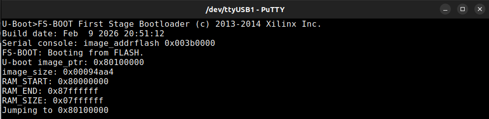 Contains the file download.bit, which the petalinux-build command creates. It is composed of system.bit (FPGA bitstream exported from Vivado) and fs-boot.elf (first-stage bootloader). Fs-boot log can be seen in Fig 7, and fs-boot.elf can be configured using commands: