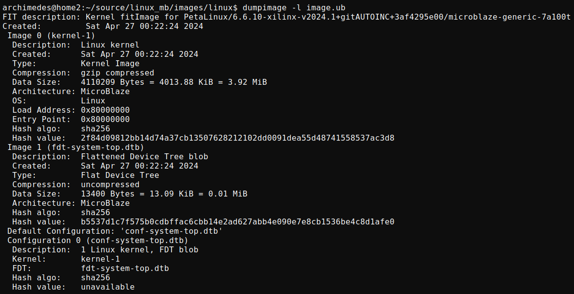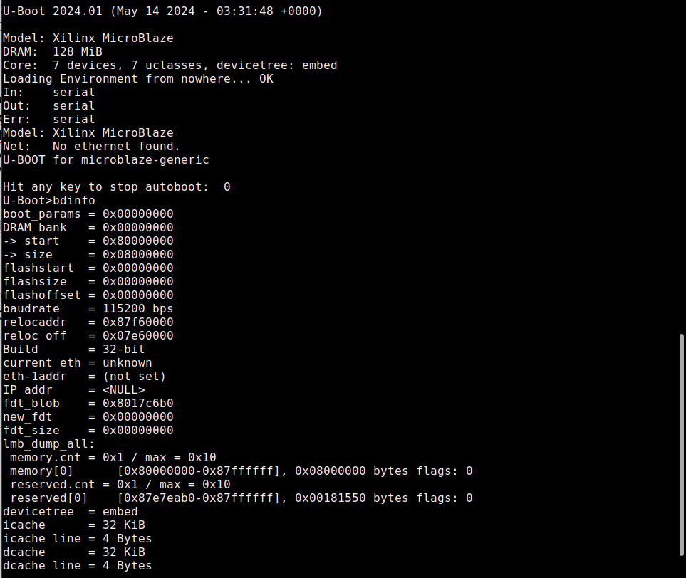 Contains U-boot-s.bin our second-stage boot loader. Configuration of U-boot is scattered over the petalinux-config and petalinux-config -c u-boot . An important value is the Text Base, mine set to 0x8010_0000, FSBL will write U-boot into this memory address and execute it. You can interact with the U-boot prompt for live debugging, either by loading the full BOOT.bit or simply petalinux-boot jtag --fpga which will loads all relevant binaries into memory until U-boot. Fig 8 below shows my U-boot log, and issuing the bdinfo command to print board information, shows my 32-bit processor architecture, DDR2 of 128 MB starting at 0x8000_0000 and ending at 0x8800_0000, the relocaddr where U-boot will be relocated to when the kernel loads, and instruction/data caches of 32 KB each.