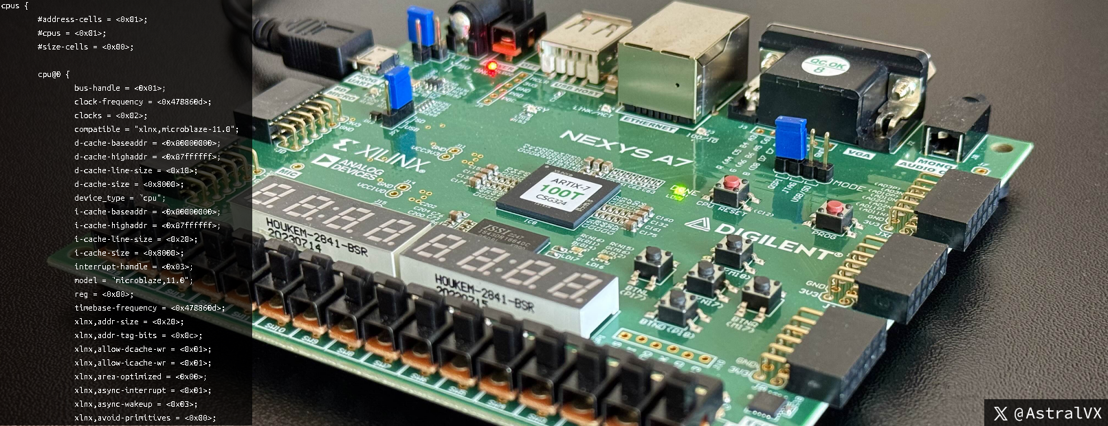 DDR2 memory of 128 MB is at address 0x8000_0000 to 0x8FFF_FFFF, so from Linux this is the address range to read/write to this volatile RAM. The 16 MB SPI Flash is located at 0x4500_0000, so if you want to read say offset 0x1000 in Flash, from the Linux kernel read system address 0x4500_1000, and under the hood the SPI protocol cycles will be generated and data returned to you over the standard AXI bus. To read and write from push buttons and LEDs, the GPIO space is at 0x4000_0000, of course 64 KB is a bit much for 6 bits worth of signals haha. At address 0x0000_0000 I have my 128 KB of BRAM, the ultra fast, low-latency scratchpad memory (this is not equivalent to L1 cache on CPUs, instead L1 cache would be equivalent to my 32 KB instruction cache and 32 KB data cache talked about later). Since I have don’t have any memory protection in the form of IOMMU etc, a Linux user could easily cause havoc by writing to the timer register space at 0x41C0_0000, but this is a POC.
