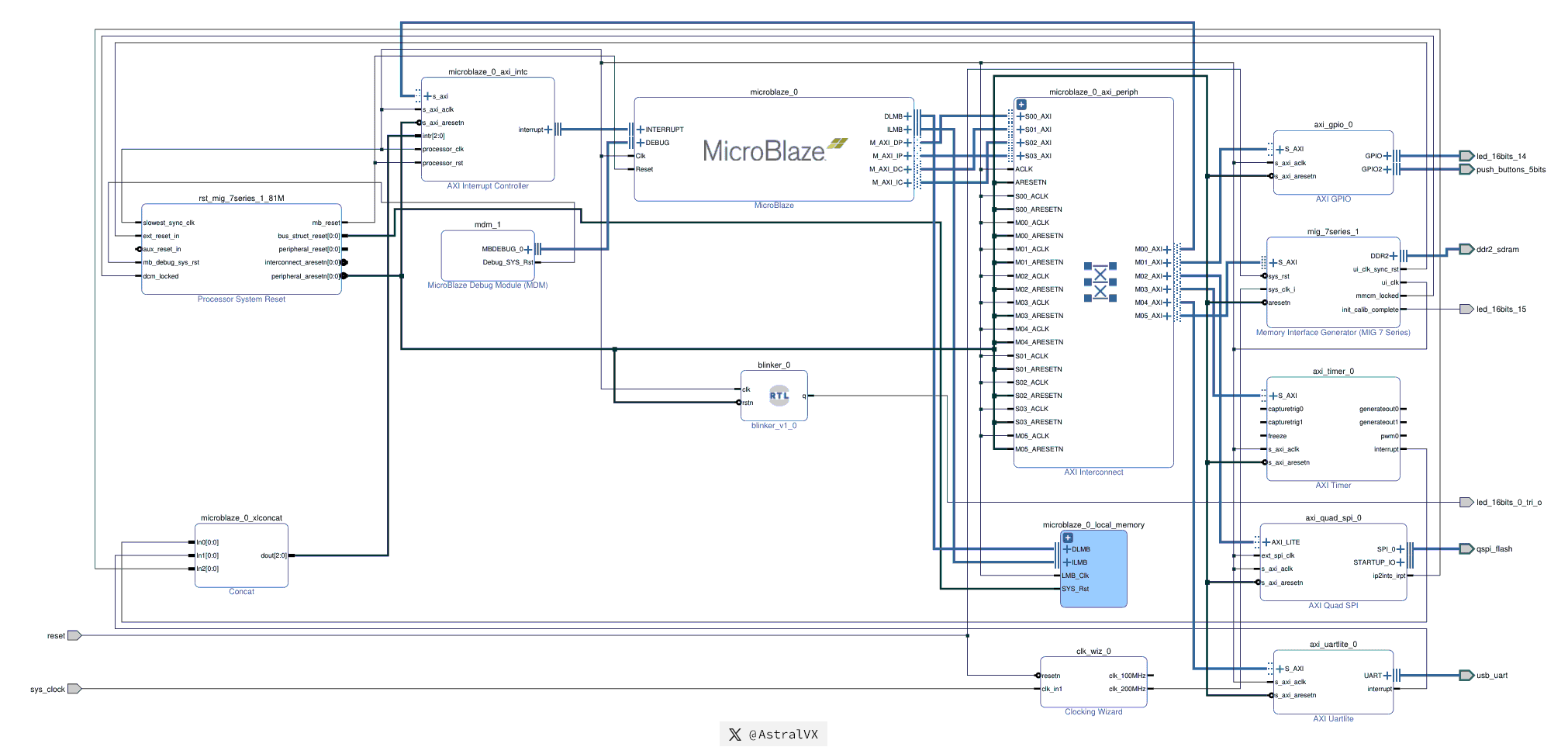 • Microblaze_0_local_memory is the (Block RAM) BRAM of 128 KB, used by bootloaders for pre-DDR temporary volatile storage. BRAM is small, fast, dedicated on-chip memory with 1 cycle latency (10ns @ 100 MHz), unlike DDR which often has 160 ns access times