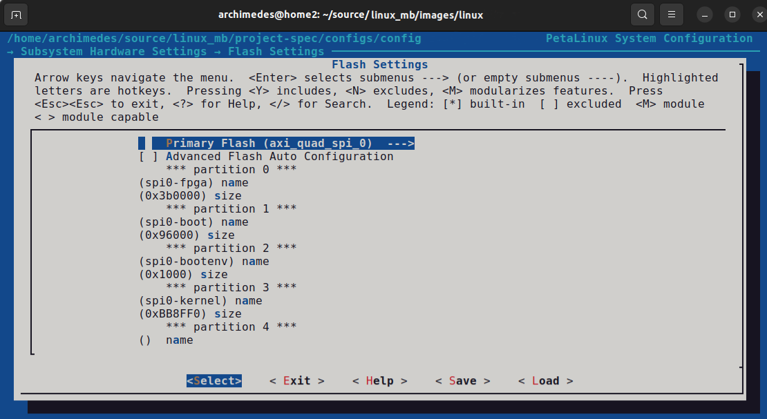 Using the above PetaLinux configurations and after several weeks of development, debugging, and troubleshooting, I finally succeeded in booting a Linux kernel booting from QSPI. Fig 6 below shows the final flash layout for my 16 MB SPI. These fixed partition sizes give a little bit of wiggle-room if the binaries grow, overall all 16 MB is consumed, and it was painful removing U-boot packages, rootfs packages, and kernel modules, to make it fit into 16 MB while keeping the system functional.