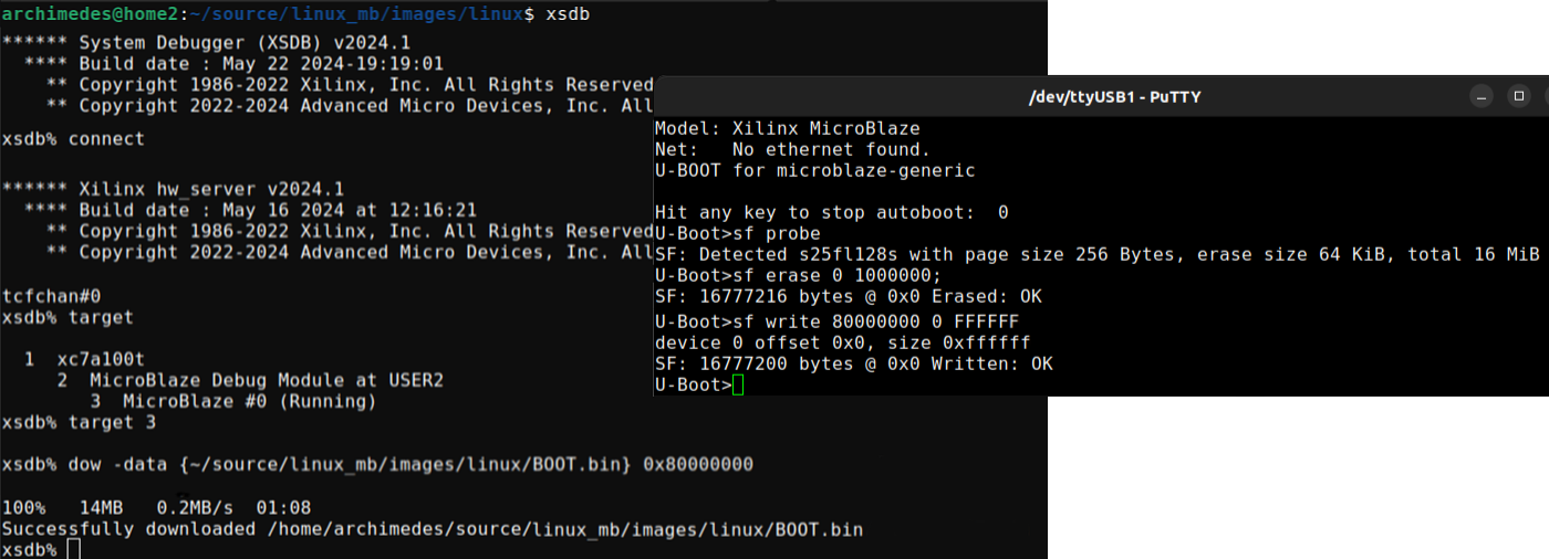 xsdb > connect ; target 3 ; dow -data {~/source/linux_mb/images/linux/BOOT.bin} 0x80000000
